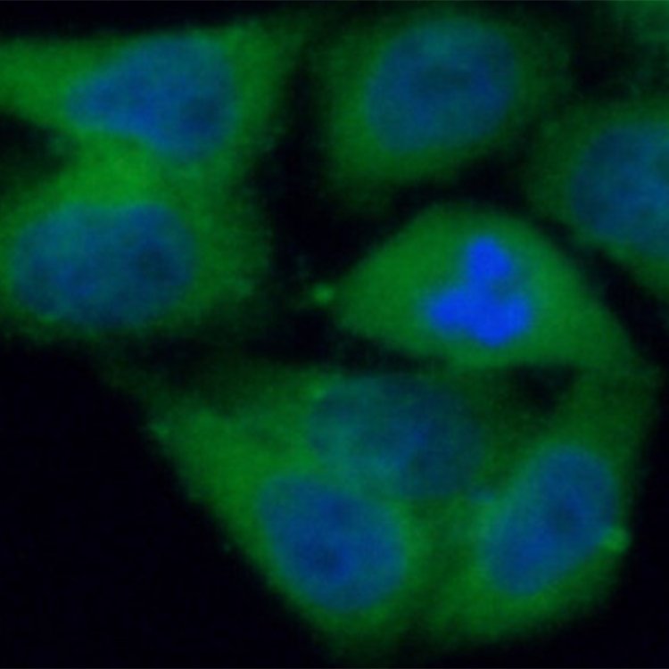 Immunofluorescent analysis of HeLa cells using FNab06104 (PADI2 antibody) at dilution of 1:50 and Alexa Fluor 488-conjugated Goat Anti-Rabbit IgG(H L)。