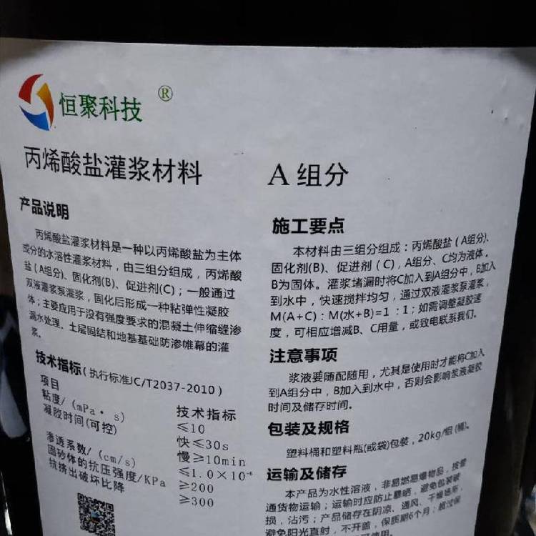 HJ501N丙烯酸盐灌浆材料是一种以丙烯酸盐为主体成分的水溶性灌浆材料.由三组份组成,丙烯酸盐(A组分)、固化剂(B)、促进剂(C)。一般通过双液灌浆泵灌浆,固化后形成一种弹性凝胶体,主要应用于没有强度要求的渗漏水处理、土层固结和地基基础防渗帷幕的灌浆。