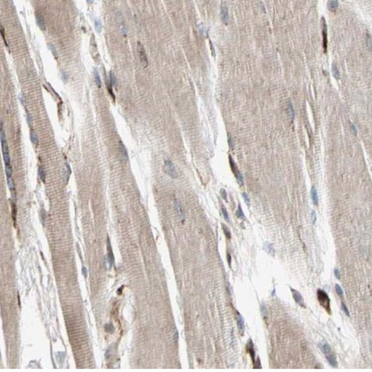 将FNab00321(ACTA1抗体)以1:50稀释度,使用石蜡包埋的人骨骼肌组织切片进行免疫组织化学实验。