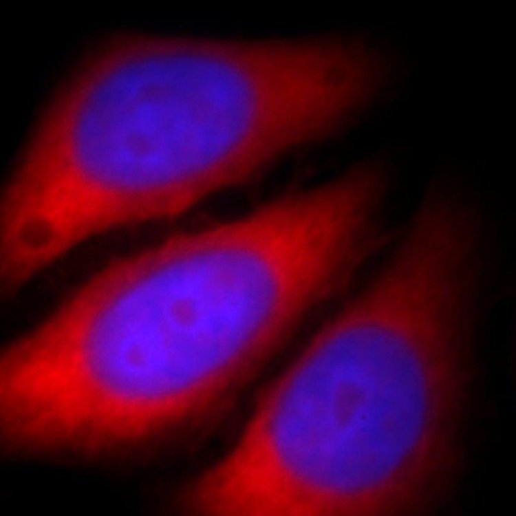 将FNab00321(ACTA1抗体)以1:50稀释度,使用HepG2细胞及罗丹明羊抗兔IgG二抗进行免疫荧光实验分析。