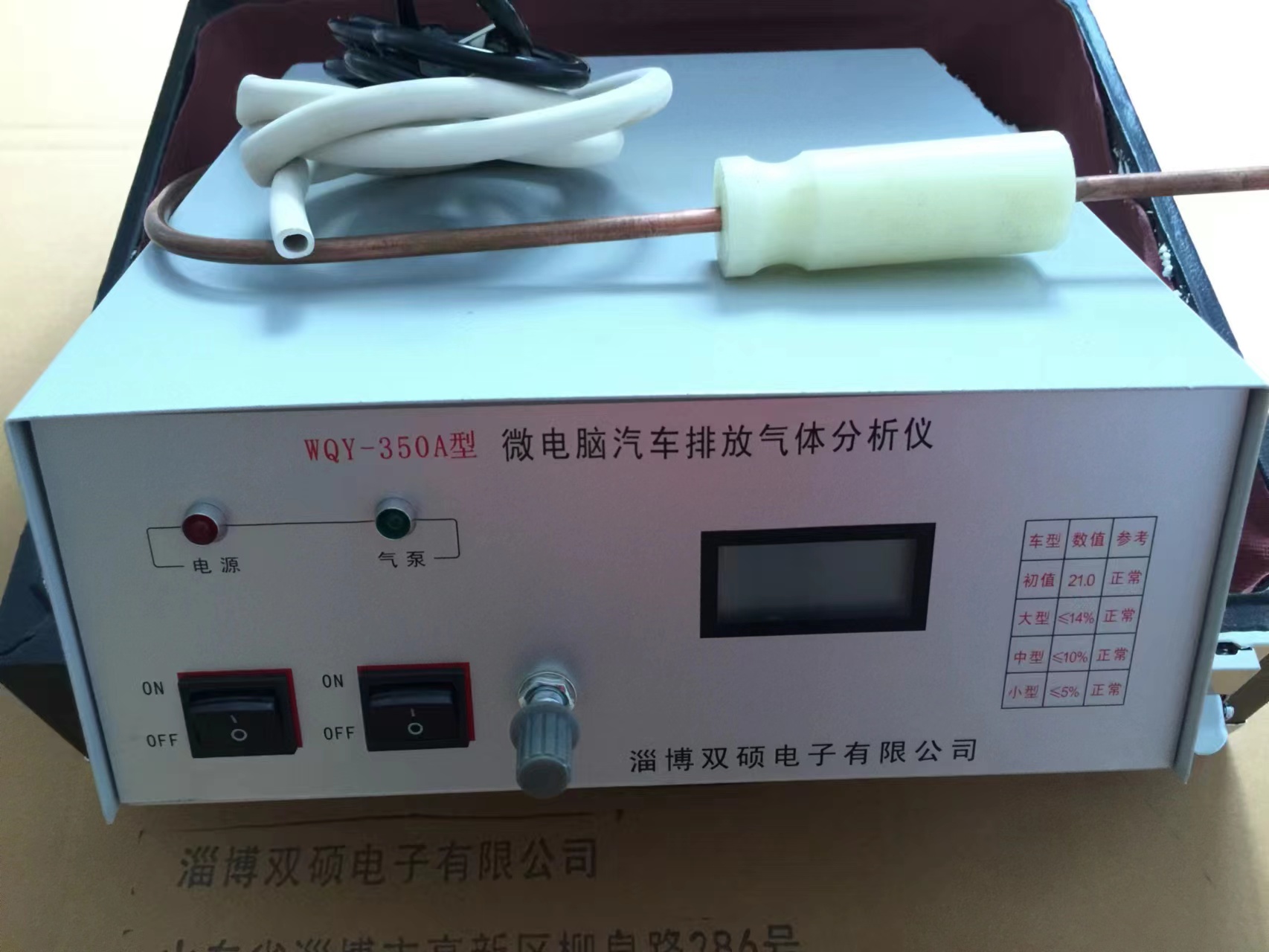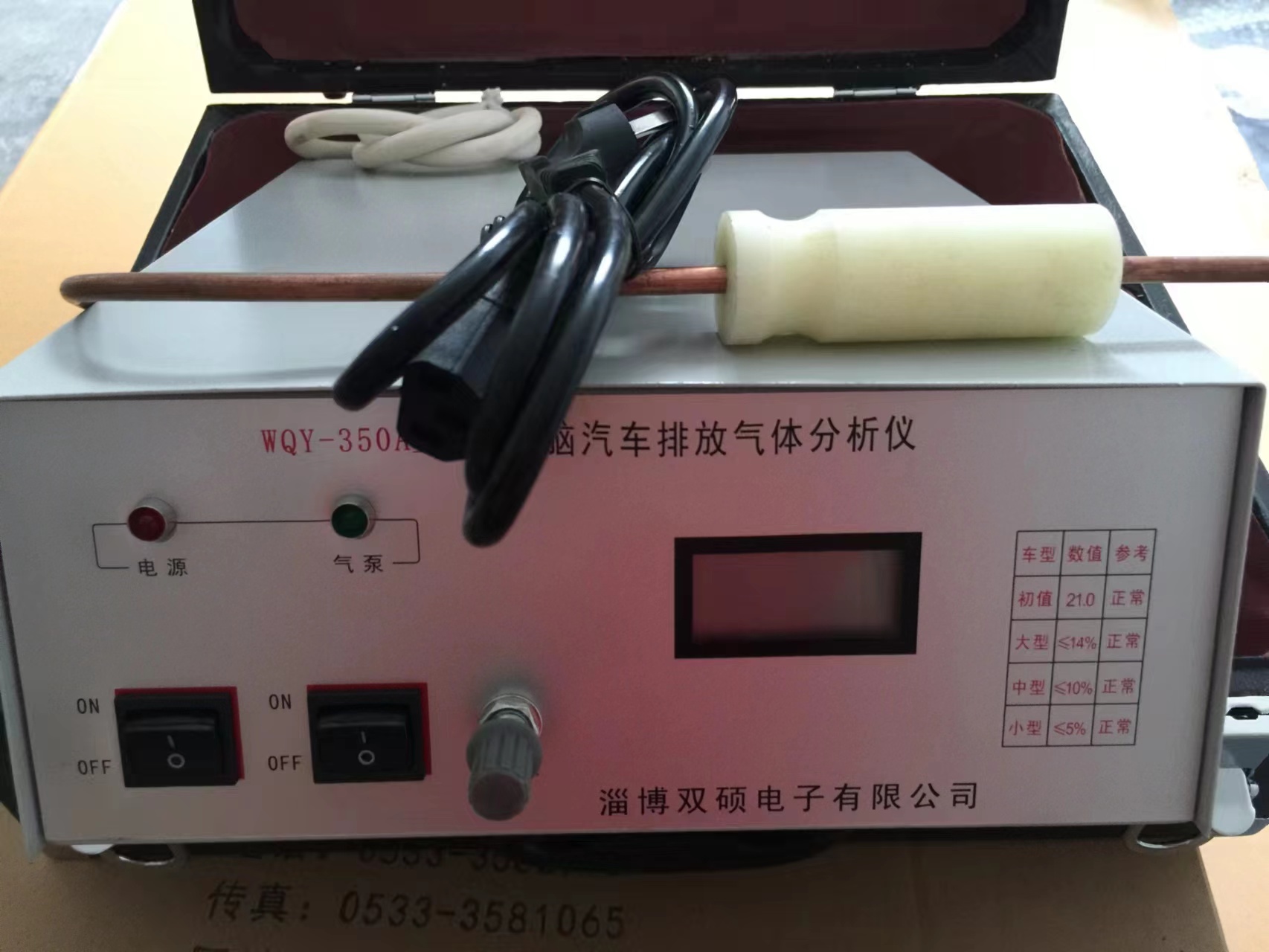 WQY-350A型微电脑汽车排放气体分析仪是对汽车尾气中的含氧量进行分析,从而判断出汽车尾气中一氧化碳(CO)和碳氢化合物(HC)的排放量是否符合国家标准的要求;还可从排放尾气的含氧量(%)大小,反映出发动机的空燃比是否在最佳动力性和经济性状态。该仪器是专门为汽车维护、修理部门而设计的,能满足对排放气体分析的需要,具有结构紧凑、操作简单,使用方便且价格低廉等特点,是汽车维护、维修行业理想的检测设备。