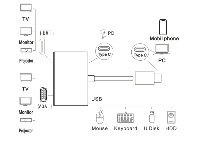 硕盟SM-T54是一款USB-C 四合一多功能扩展坞,支持四口同时使用,您可以将含有USB 3.1协议的电脑主机,通过此产品连接到具有HDMI或VGA的显示器、电视机或其他显示设备。产品可以接入硬盘、U盘、鼠标、键盘和光驱等HDMI或VGA设备。 另外,此产品还可以通过USB-C接口给电脑主机进行充电。
