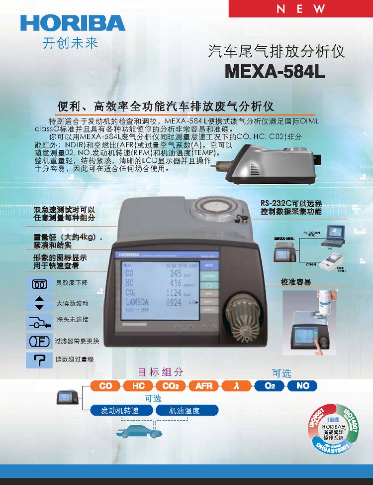 便利、高效率、全功能汽车尾气分析仪。特别适合于发动机的检查和调校,HORIBA MEXA-584L便捷式汽车排放尾气分析仪满足国际ISO3930/OIML class0 标准,并且具有各种功能使你的分析容易和准确。你可以用MEXA-584L汽车尾气分析仪同时测量怠速工况下的CO,HC,CO2(非分散红外法:NDIR)和空燃比(AFR)或过量空气系数(λ)。你可以选择测量O2,NO,发动机转速(RPM)和机油温度(TEMP)。整机重量轻、结构紧凑、清晰的LCD 显示器,操作简单,因此可在任何场合使用。