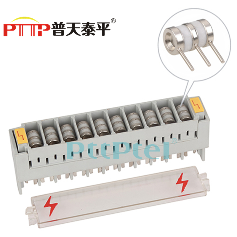 保安单元插入在保安接线排上,当通信线路受强电侵袭出现高电压、潜电流、大电流等情况时,起到保护作用。保安接线排未插入保安单元时,内、外线处于断开状态,插上保安单元后,内外线路接通。当保安单元插入保安接线排后,保安单元的接地插脚穿过保安接线排的接地孔与接地条相连接,每个保安接线排的接地条与接地的架体连接在一起,组成了整个配线架的接地系统。
