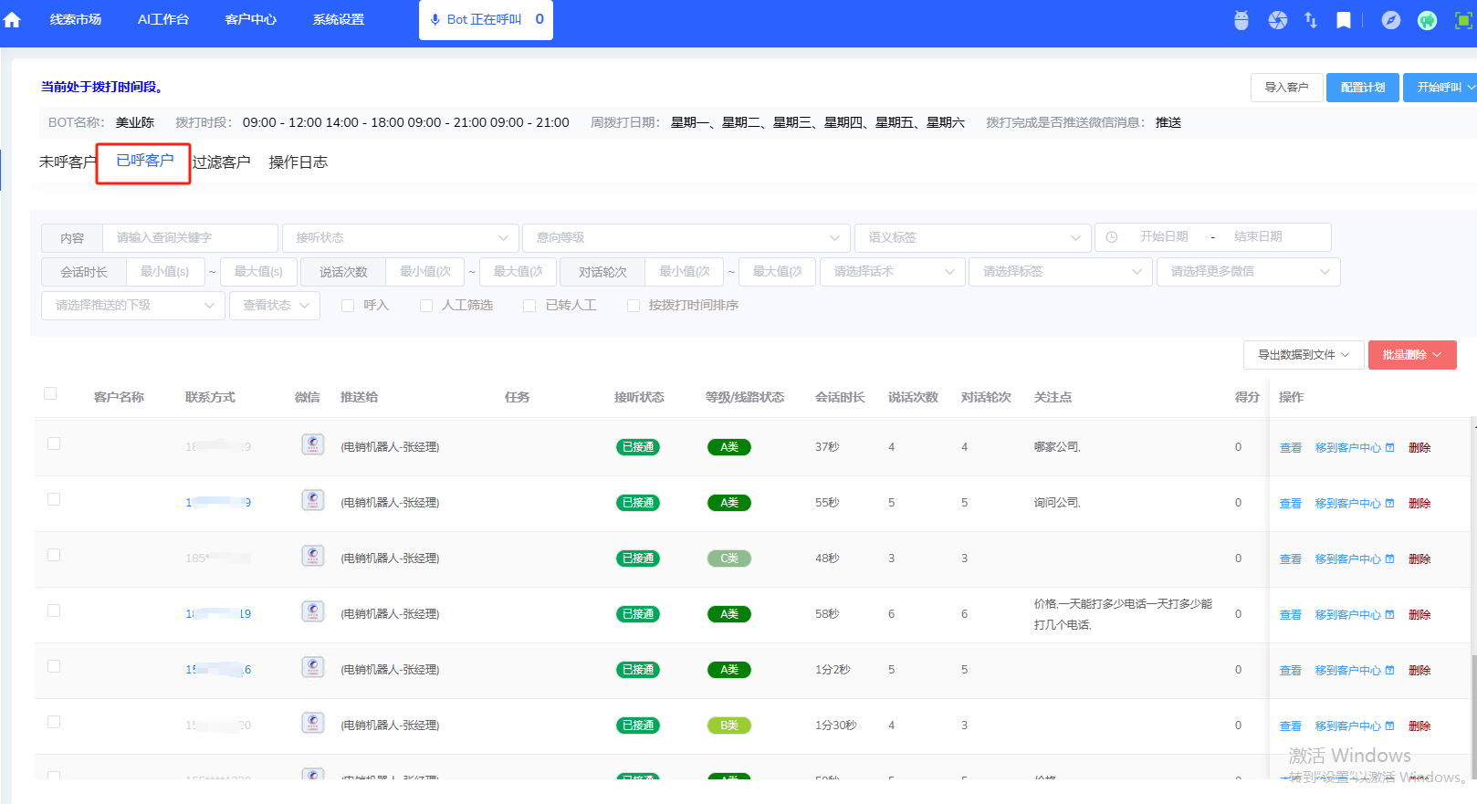 4、会根据通话内容自动的分类成A、B、C类客户,自动标记未接通的电话。并且可以记录整个通话内容,通过文字和语音的模式记录在后台