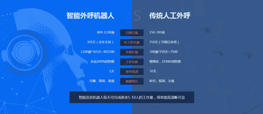 1、人工一天只能打200-300通电话,而机器人每天的通话量在3000+以上,可以说是人工的5-10倍,效率高。详细13526696148