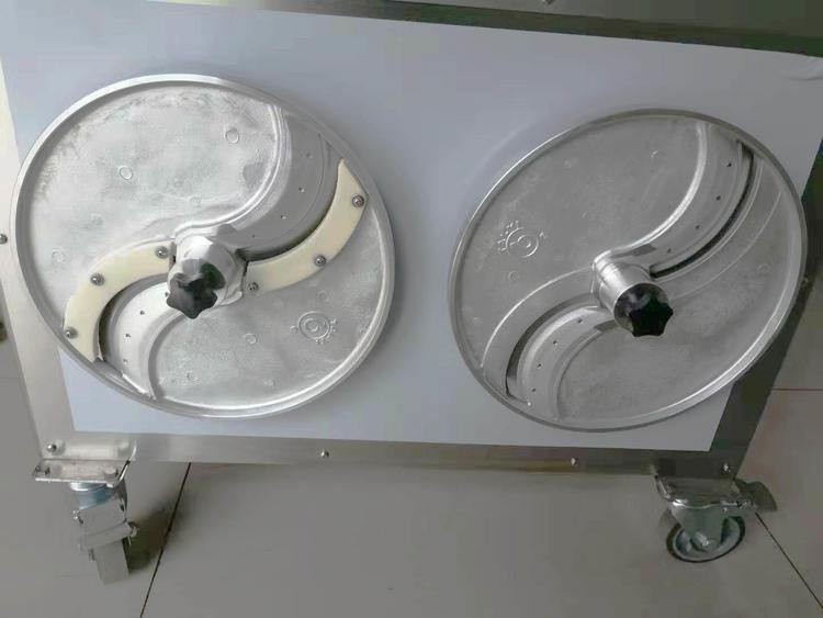 ? 5、本机为双头型切菜机,可同时工作,通过更换刀盘或双调频调节输送带与斩刀速度,可切出