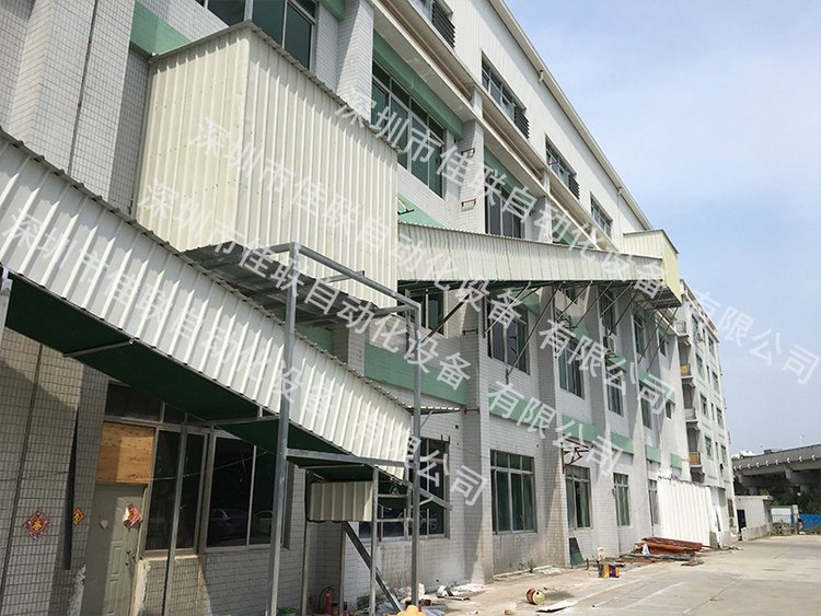 1) 1-3楼斜坡出货滑梯装货柜车_二楼卸货装车倾斜皮带输送机这种输送机除带长可以根据需要加长或是缩短外,机框还可以倾斜,因此,可以根据搬运的距离和装卸点的高度差任意设置,适用于盒装或袋装物料的搬运作来.这种输送机常用于车辆的装卸,货物的码垛和卸垛,并可用于有通道穿行,或因有建筑隔墙横断输送;