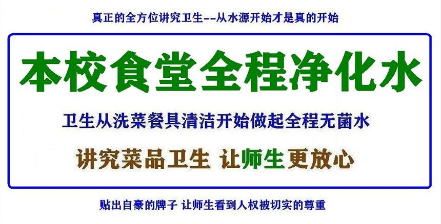 但是说句实话这几年我国的机关单位、事业单位、学校院校、军队等有条件建立食堂的单位、对部门工作人员、学校院校的师生、军队的军人在卫生问题还是比较关心的,很多食堂还是很注重食堂用水的卫生、舍得配置净化设备,但是放眼全国大部分食堂在选择净水设备时被诱导进了一个误区,对净水设备不了解、多花了不少钱水干净是干净了但是对身体没什么好处,因为基本都选择的是反渗透设备、大家都知道反渗透是纯水而不是纯净水、纯水是不含任何矿物质的、人类是不能长期饮用的、特别是条件好的单位平时都是喝的是瓶装水、目前市场上的瓶装水基本也是反渗透生产出来的水、在加上每天三顿饭也是纯水做出来的可想而知。让大家自己去比对吧。