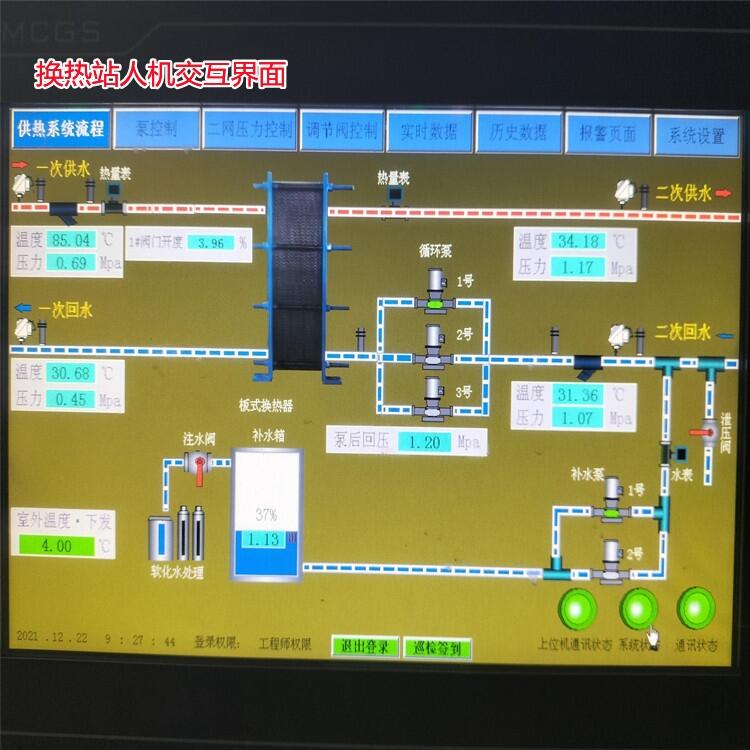 2、机组根据环境温度、一次及二次管网温度、压力等参数来调节热源及热水供给量,在系统运行中对热能、电能有明显的节约效果。