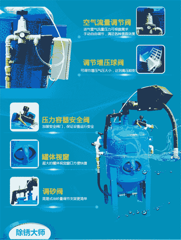 采用美国先进的砂阀结构,能精确调节砂和气压的大小。