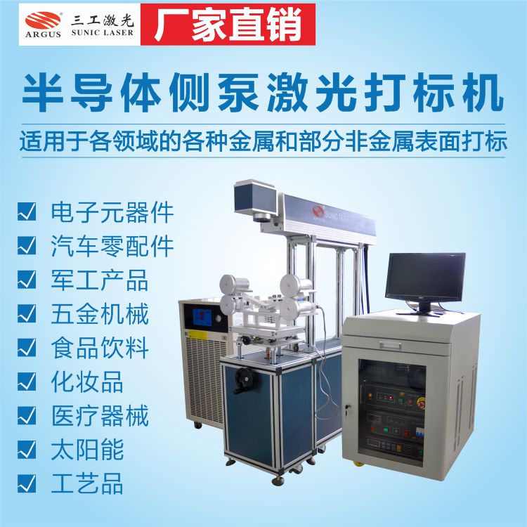 该设备适用于电子元器件、通讯、汽车摩托车零配件、仪器仪表、航空航天、产品、五金机械、工具量具刃具、洁具、医药、食品饮料、化妆品、药品包装、医疗器械、太阳能、工艺品等行业的各种金属和部分非金属打标。