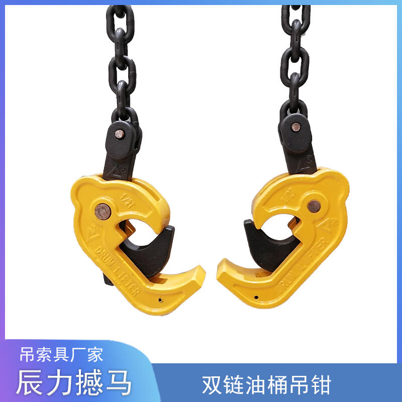 SL型双链油桶吊钳是专用于各种带卷边的油桶吊运工具,可以竖直或水平夹起油桶。其结构形式为:吊环+起重链条+油桶夹子,如果需要定制,每个结构使用的吊具可以自由选择,比如用子母起重吊环组合成四肢也是可以的。