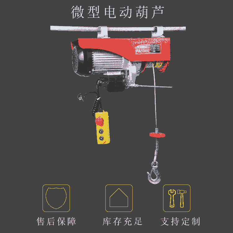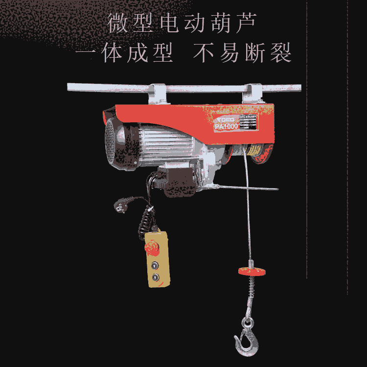 微型电动葫芦体积小、重量轻、安装携带方便、使用可靠。吊钩加厚材质处理,一体成型,不易断裂,承重力强。