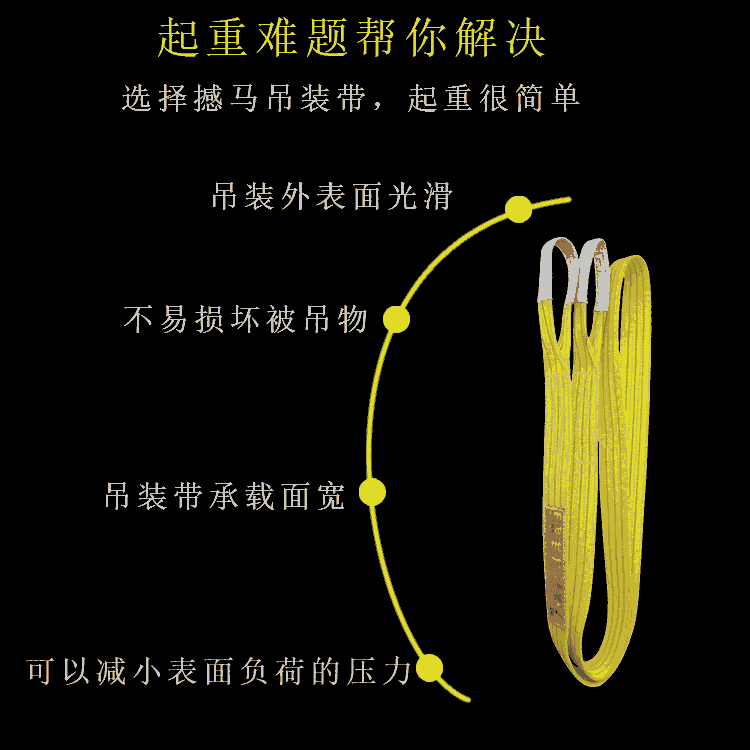 ★扁平带的标准吨位除可用颜色来区分外,还可以根据宽度的不同,来区分不同的承载吨位,在吊装作业时,能够提供宽阔的、平顺的承载表面。