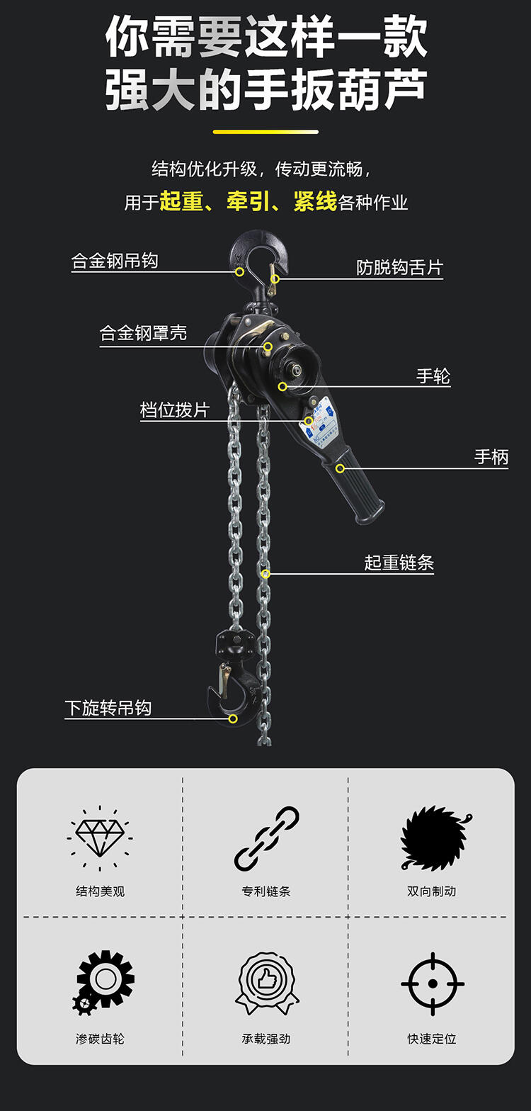 手扳葫芦适用于造船、邮电、矿山、电力、交通运输等部门在无电源场合用作重物起吊、设备安装、机械牵引等作业。本系列葫芦可在空载时快速拽动起重链,实现下吊钩的快速定位。