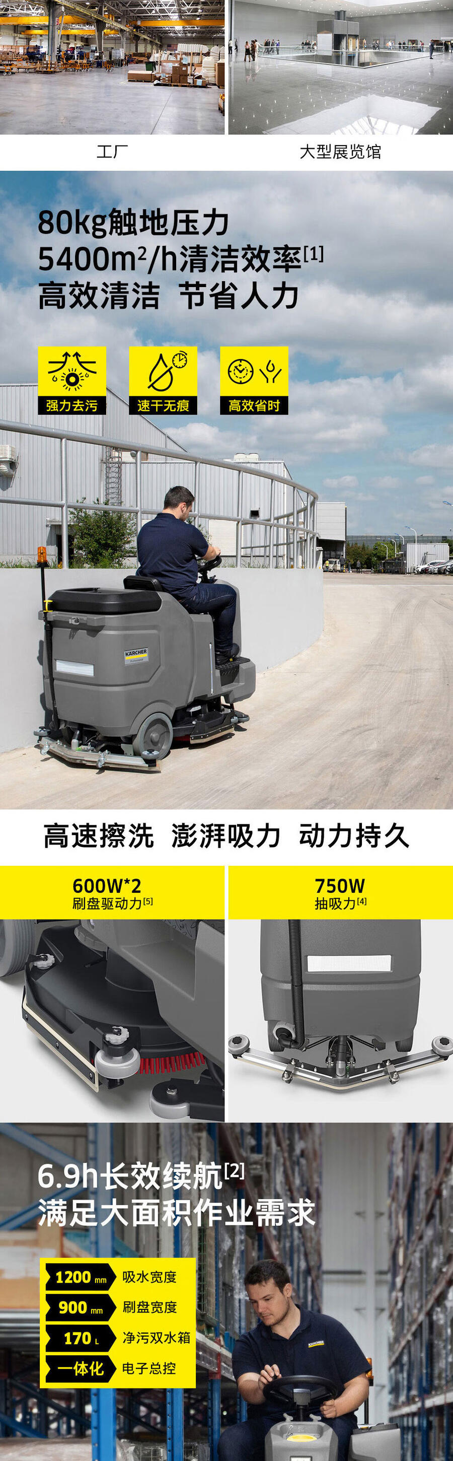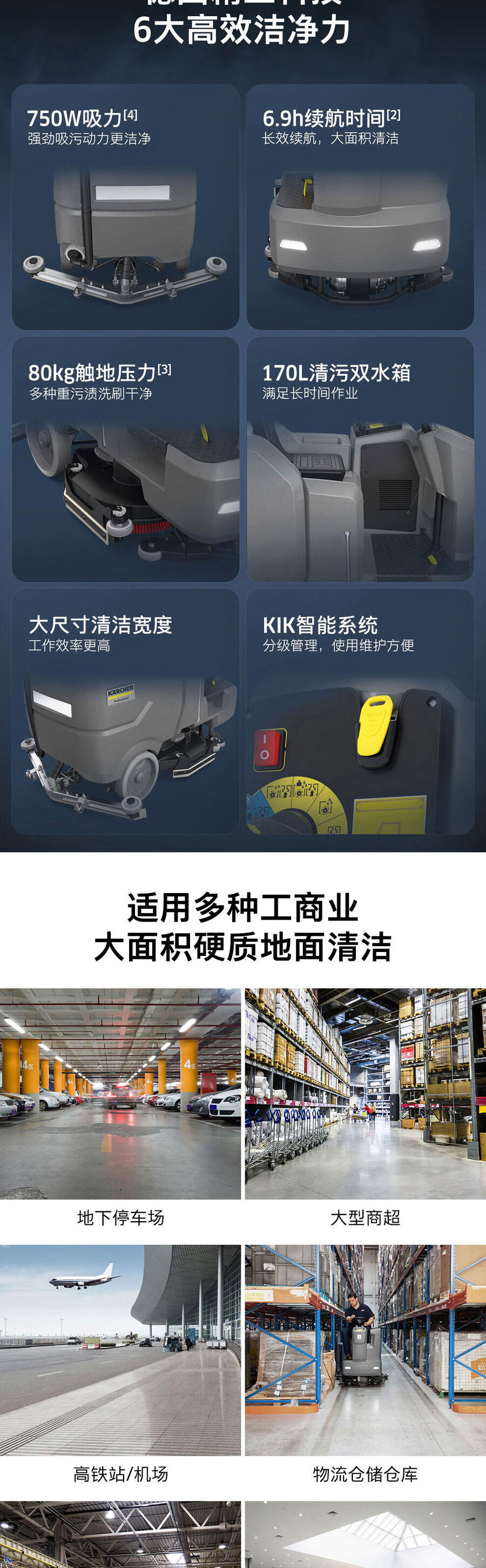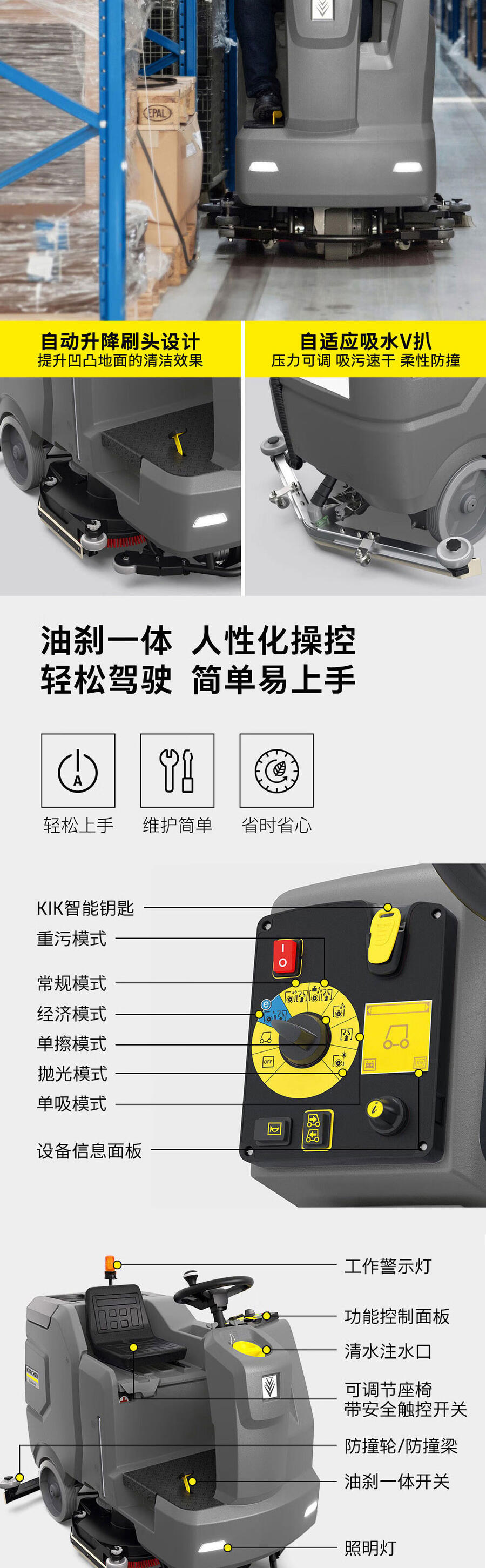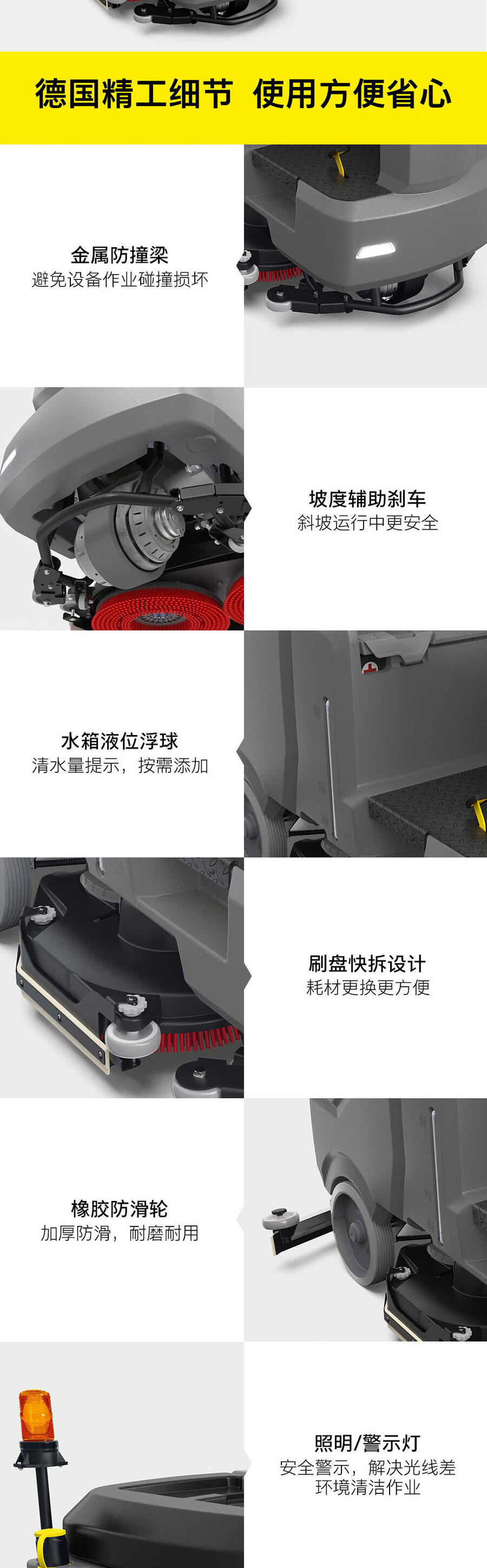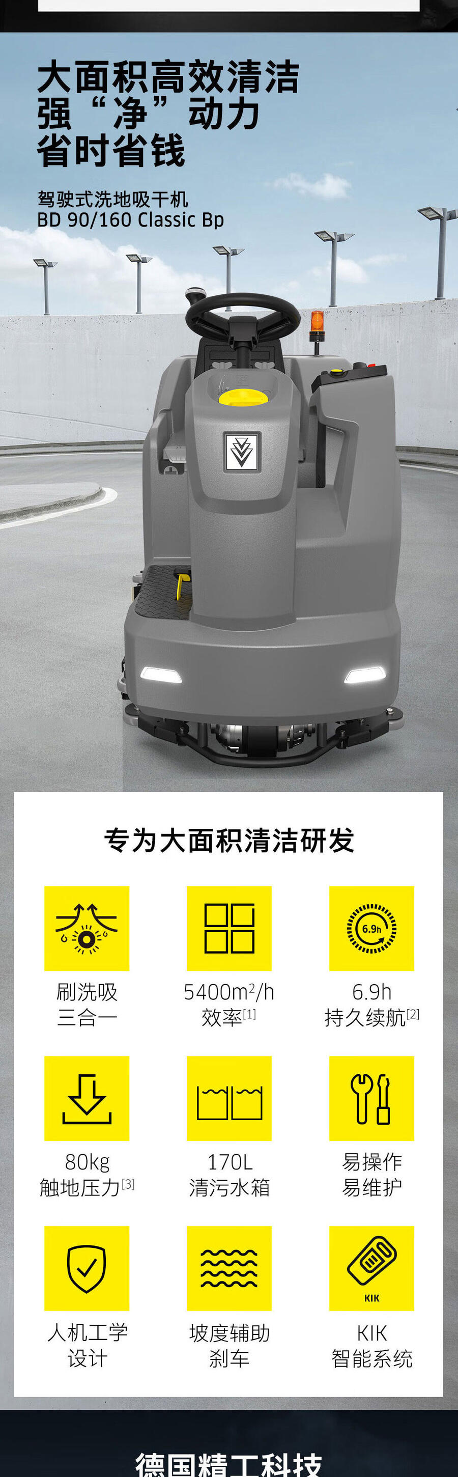 BD 90/160 R Classic Bp拥有令人信服的性价比。标配了容量160升水箱,宽敞的电池箱可容纳300 Ah电池,工作宽度可达90 cm,适合大面积清洗——80公斤刷头触地压力,750瓦吸力,确保了更好的清洗效果。此外,BD 90/ 160R Classic Bp配备的卡赫创新的KIK系统,用于防止使用中的误操作。在机器运行过程中,防滑轮确保了安全行驶。集成LED和警示灯则是为用户和周边区域提升了安全性。自动电子停车制动,自动升降刷头和刮板,确保了机器可靠的使用寿命。经过验证且可靠的组件确保了最少的维护工作量和较低的服务成本。