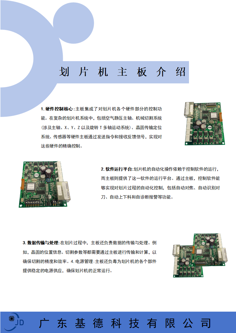 1.硬件控制核心:主板集成了对划片机各个硬件部分的控制功能。在复杂的划片机系统中,包括空气静压主轴、机械切割系统(涉及主轴、X、Y、Z以及旋转T多轴运动系统)、晶圆传输定位系统、传感器等硬件主板通过发送指令和接收反馈信号,实现对这些硬件的精确控制。2.软件运行平台:划片机的自动化操作依赖于控制软件的运行,而主板则提供了这一软件的运行平台。通过主板,控制软件能够实现对划片过程的自动化控制,包括自动对焦、自动识别对刀、自动上下料和自诊断报警等功能。3.数据传输与处理:在划片过程中,主板还负责数据的传输与处理。例如,晶圆的位置信息、切割参数等都需要通过主板进行传输和计算,以确保切割的精度和效率。4.电源管理:主板还负毒为划片机的各个部件提供稳定的电源供应,确保划片机的正常运行。